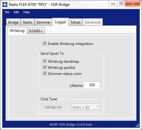 On the Logger tab, as of now there is only one logger, WriteLog. If you have WriteLog (even older versions should work fine), just start the program. After a few seconds, synchronization starts automatically. No port assignments are necessary because SDR-Bridge is CAT-free.