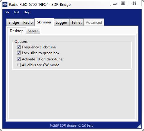 SDR-Bridge v1.5 contains new spport for either a single or for multiple FlexControls. This support is enabled and controlled from the Knobs tab. Knob support is independent of Skimmer and WriteLog integration. No Skimmers are needed to use the knobs.
